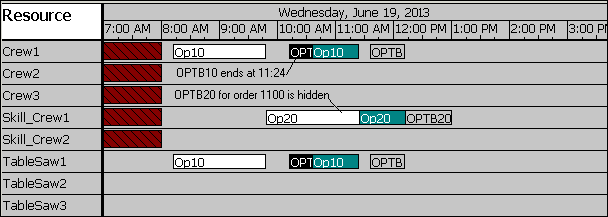 En mode APS infini, plusieurs tâches sont affectées aux mêmes ressources; certaines barres du diagramme de Gantt (opérations) sont donc masquées par d'autres barres (comme indiqué sur le graphique).