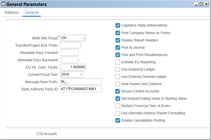 3. On the General tab, specify at least these options. Many of these parameters enable or disable other features and fields in SyteLine. Use the online help to select the options you need.