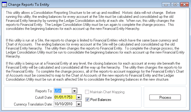 - At each site and lower-level entity, run the Change Reports To Entity utility and specify the entity to which this site or entity reports.