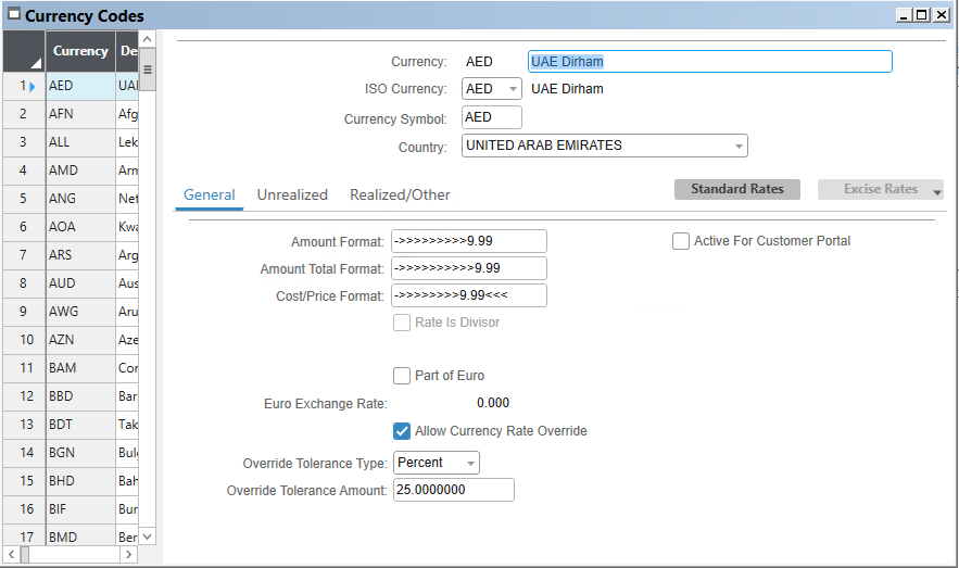 • Use the Allow Currency Rate Override field to determine whether a currency exchange rate can be overridden. If you select this check box, the exchange rate can be overridden on transaction forms. You can also specify the override tolerance type and amount to be used. You can clear the setting for a selected currency code on the Currency Codes form. However, if you clear the Allow Currency Rate Override option on the Multi-Currency Parameters form, then even if the setting is selected on the Currency Codes form for a specific currency, overrides are not allowed.