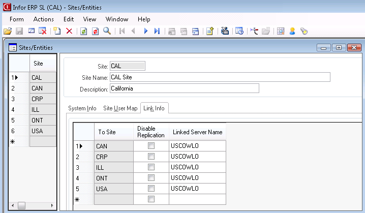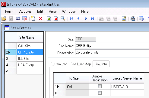 - On the Sites/Entities form, ensure that each site that was linked to the current site has a record in this form. This record creation should happen automatically for sites in the same database. For sites in different databases, see Linking databases.