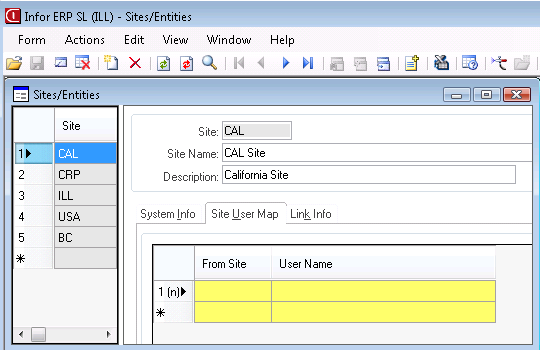 - For site/entity records where the current site/entity will perform transactional replication with the local site, the Site User Map tab looks like this: The tab is blank because no Site User information is required from ILL to CAL.
