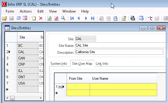 For the local site’s site/entity record when the local site is not used as the "bootstrap" configuration, the Site User Map tab looks like this: No sites are listed in the Site User Map tab (because the CAL site does not replicate data to itself).