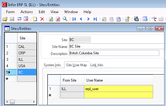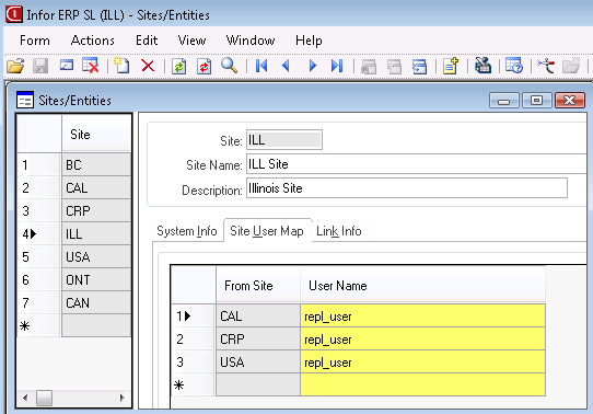 - For the local site’s site/entity record when the local site is also used as the replication "bootstrap" configuration for the utility server, the Site User Map tab looks like this: The Site User Map lists all the other sites on the utility server where replication will be "bootstrapped" from ILL (the local site).