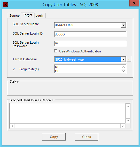 - On the Target tab, the SQL server name, login ID and password values are populated from the previous tab, but you can change them.