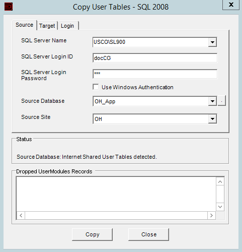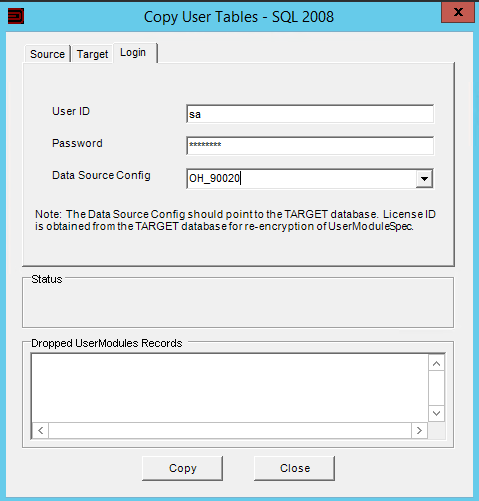- Select a target database. This must be a SyteLine application database, version 9.00.x or above. It cannot be the same database as the source database.