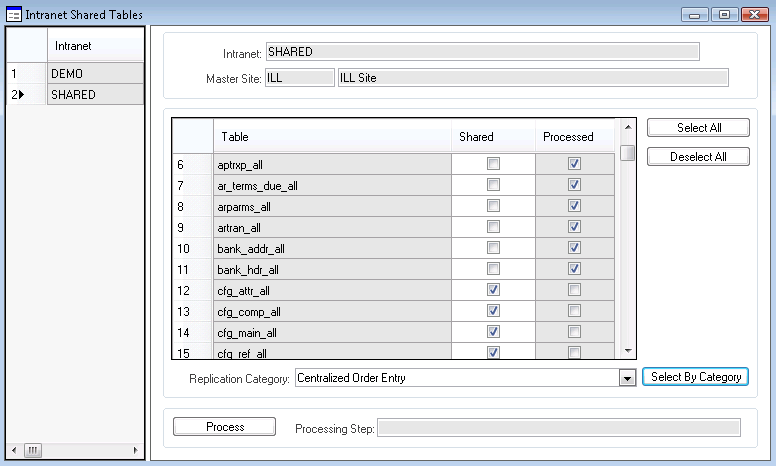 - Click Process to copy information from the tables at the other sites to the master site's table, delete the table from the other sites (creating views into the master site tables instead), and regenerate the replication triggers for the other sites. If you have selected several tables and have many sites on this intranet, processing may take a while. The Processing Step area displays the system's progress.