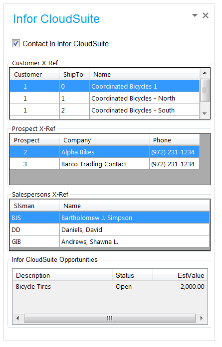 - If you selected a salesperson, the SyteLine Opportunities field shows the opportunities associated with the salesperson and contact, if the selected contact is a SyteLine contact. Otherwise, the opportunities associated with the salesperson are displayed.