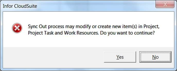 - Sync Out - Sync Out creates a new task or material resource in SyteLine. An update is performed for the existing item. The following message displays when you click Sync Out.