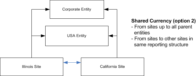 - If currency and rate maintenance is performed at sites, then you should replicate the Shared Currency category from the sites up to the entity to which the sites report (and not back down to the sites from the entity). When using this setup, sites within the same reporting structure should also replicate currency and rate information between the sites. This flow chart shows an example of this option: