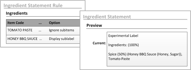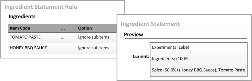 In the Ingredients tab of the Ingredient Statement Rule form, the Option field helps to determine how much information is displayed in the ingredient statement. You can: