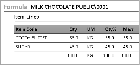 - Create a formula that has 2 items: Cocoa Butter and Sugar.