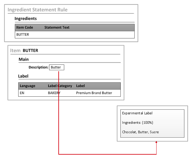 You can create an ingredient statement that shows text in different languages. For example, you can use French text for chocolate and sugar and English text for butter.