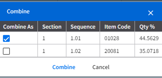 Note: : If item function is specified for both rows, the item function of the combined row is overridden by the item function of the row selected in the Combine window.