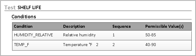 Parameters can be used for test conditions and results. This example shows the conditions for the parameters that are on the Shelf Life test method.