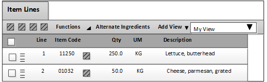 A default view is provided for the Parameters tab and the Item Lines tab. You use this default view as the basis to create a new view.