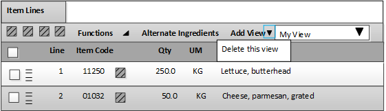 Removing custom views To remove a customized view from the Parameters tab or Item Lines tab: Click the down arrow beside the Add View button. Select Delete this view. When you delete all of the custom views for a grid, the drop-list is no longer displayed beside the Add View button.