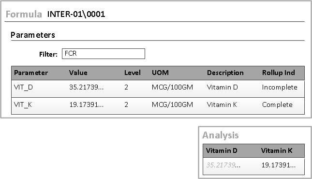 In this case, the rollup is incomplete. The VIT_D parameter was calculated with some items having a null parameter value. The VIT_K parameter was calculated from items all of which had non-null values.