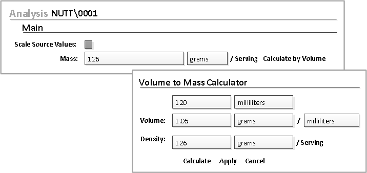 Click Calculate in the dialog to calculate the mass serving size for the mass unit of measure (1.20 * 1.05 = 126).