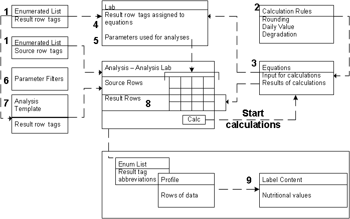 | 9 | Optional. Assign analysis objects to the label content object if you are using that functionality. The label content object contains row tags with nutritional data supplied by analysis objects. |