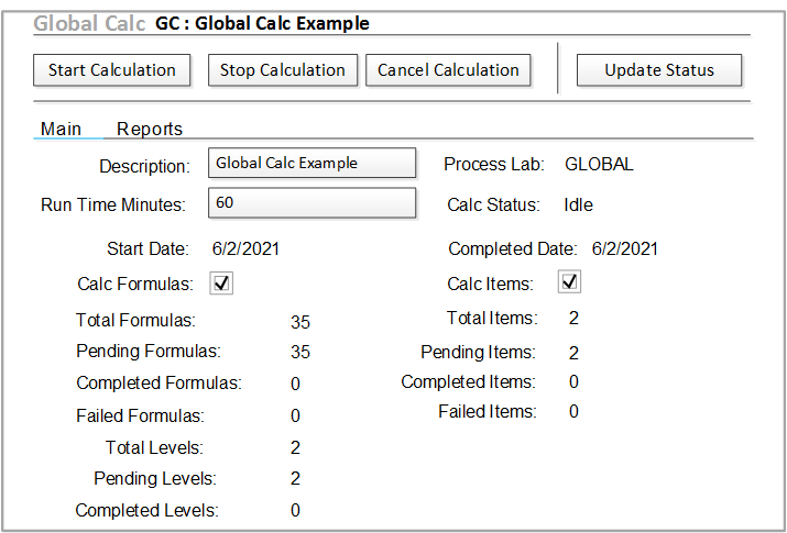 Use the buttons in the Global Calc form to manually start, stop, resume, or cancel the process.