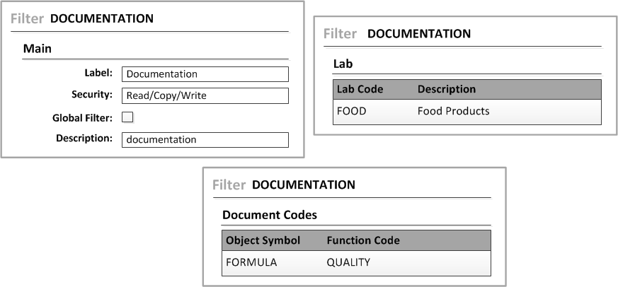 In this example, the filter enables any users in the FOOD lab to update content for the QUALITY function code. This is regardless of the formula’s security.