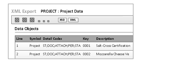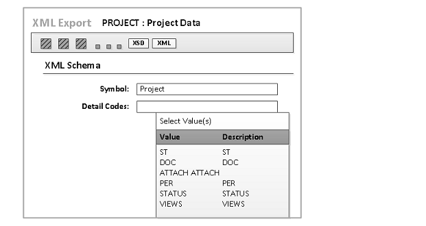 - Click XSD to create an XML schema for the selected symbol and detail codes. Only objects that are used in reports support the Export XSD button. (When you click this button, No XML data is exported.) See Sample XSD file.