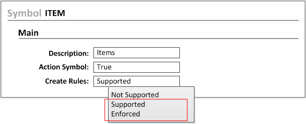 - Open the Symbol form. To enable Create Rules for the object, select Supported from the list.