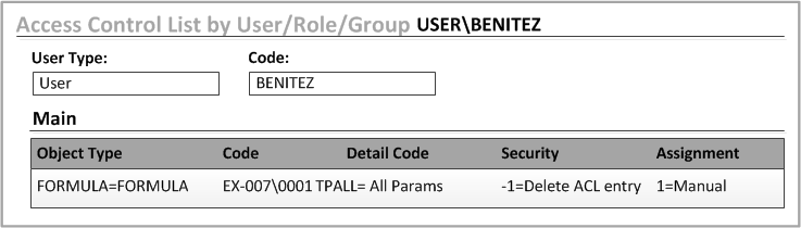 In this example, the entry for BENITEZ for formula EX-007\0001 is changed to Delete ACL Entry (-1) for the TPALL detail. This is the same as removing the entry from the list. After you complete this task, the Reports tab no longer shows the entry.