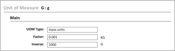 - Specify values to calculate the conversions. When you specify one value, the other value is calculated automatically. The Factor (i.e., top value) is the UOM basis for conversion for this type; this is defined in the UOM Type form.