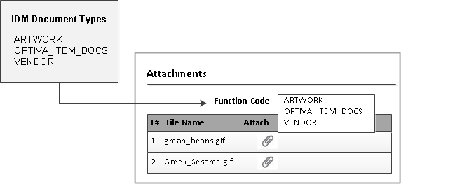 Using an XML file, you can create Document Types and import those Document Types to IDM. Then, you can configure Optiva to show those Document Types in the Attachments grid.