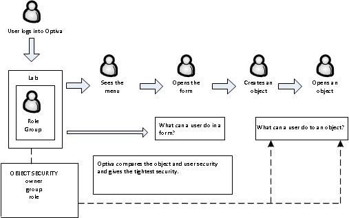 Optiva compares the object security (owner, group, and role) with the current user, user’s group, and user’s role. Then, the most secure access is granted.