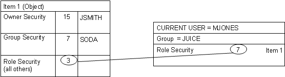 In this example, the USER is MJONES. This user belongs to the JUICE group. The user is not the owner of the object and does not belong to the SODA group. The user’s role security is compared to the object’s role security. The tightest security applies. Therefore, the user’s security for this object is 3.