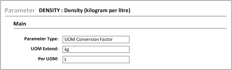 Some parameters can use a ratio to obtain the value for their units of measure. This example shows the density parameter. This parameter uses a KG/LT ratio UOM.