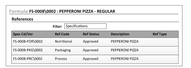 References attach and access objects that are related to the current object. For example, a formula can reference a required specification. You can open a reference by drilling down through the Reference tab; you can thereby reach other objects related to the referenced object.