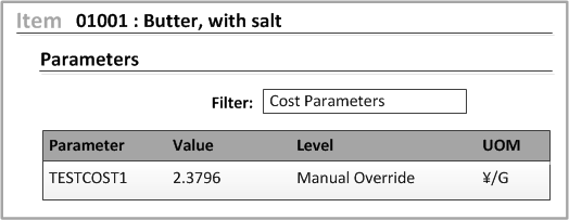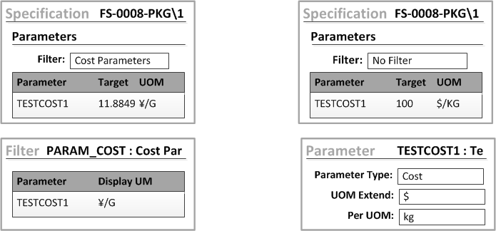 When you select the Cost Parameters filter in the Specification object, the unit of measure that is defined for that filter shows in the UOM column.