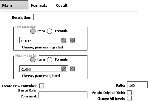 | Main tab | Specify the replacement criteria. See Replacing ingredients. |
