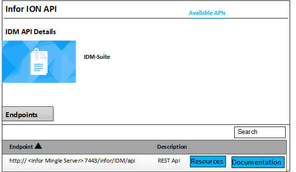Obtaining the IDM Endpoint URL Login to the Infor OS platform. Click the Infor API Gateway icon. Complete these steps in the Infor API Gateway screen: Click Available APIs. Click IDM. Write down the IDM Endpoint URL for REST Api.