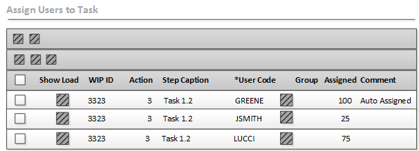 Two users, JSMITH and LUCCI, are added to this task. JSMITH is assigned a load percentage of 25 and LUCCI is assigned a load percentage of 75.
