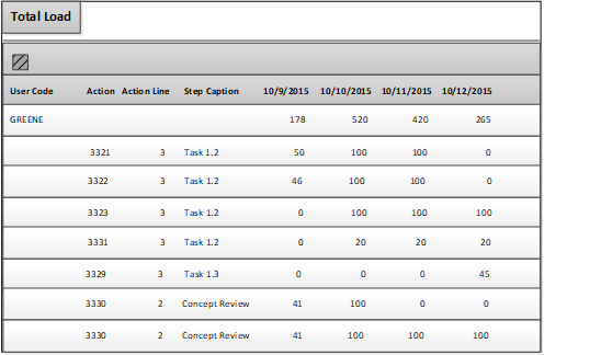 The details rows show the total percentage of time that the user is allocated to each task. Initially, the load percentages are assigned by the project manager in the Assign Users To Task page.