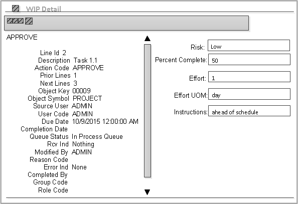 The toolbar buttons are hidden for any tasks to which you, your group, or your role are not assigned. In the WIP Detail dialog, you can add more information about the task to which you or your group is assigned.