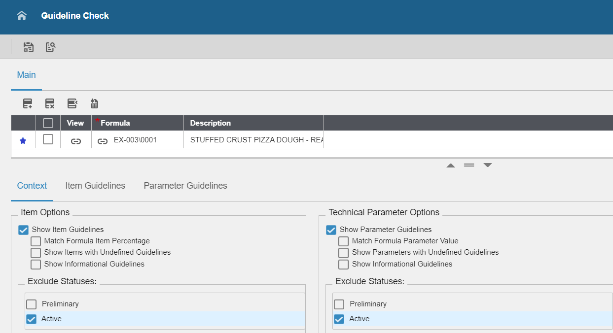 You can exclude Item and Parameter Guidelines from consideration in a Guideline Check with the Exclude Statuses control. This control is in the Context tab of the Guideline Check form. By default, no status codes are excluded from a guideline check.