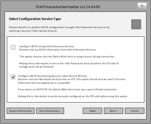 Suppose the Infor Federation Services application is not available and you are not integrating to Infor OS . Then, you can configure AD/AD FS authentication by selecting a security token service directly.