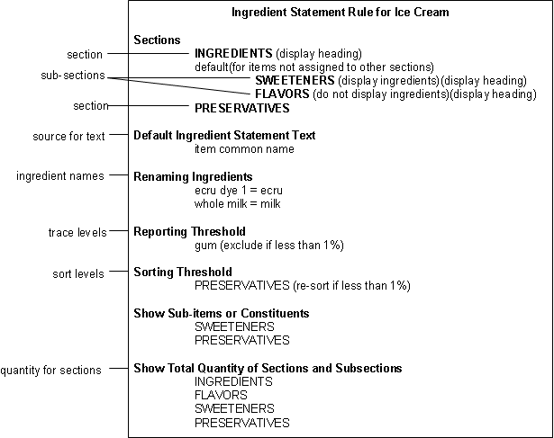 The Ingredient Statement Rule form controls the appearance of the ingredient statement. Each statement must have at least one section. You can choose to show or hide trace levels, sub-items, and quantities.