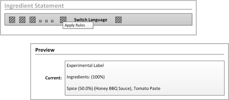 Applying the rule to the ingredient statement In the Ingredient Statement form: Add at least one formula to an ingredient statement. Add at least one rule to an ingredient statement. Click Apply Rules. The ingredients are concatenated into a statement in the Preview tab.