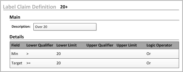 The Min column value is less than 20. The rule, that is associated with this Label Claim Definition, passes because the Target column value exceeds 20. When you specify OR as the Logic Operator, the criteria for at least one of the columns (i.e., Min or Target) must pass.