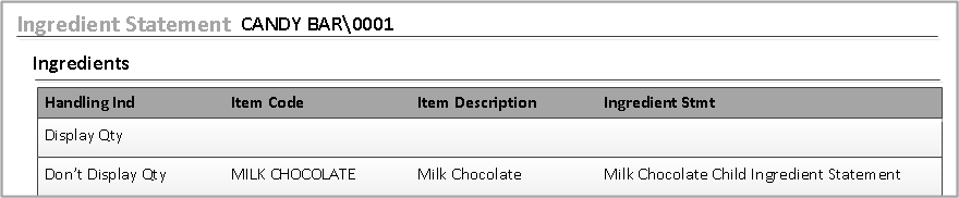 Viewing ingredients In the Ingredients tab of the Ingredient Statement form, click the link in the Item Code column to view the details for that item. Click the link in the Ingred Stmt column to view the details of the child ingredient statement.