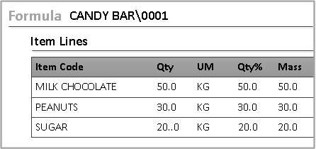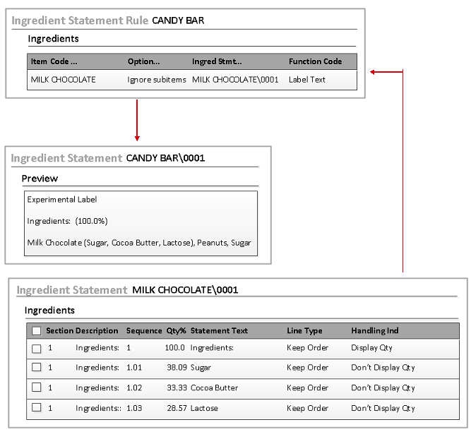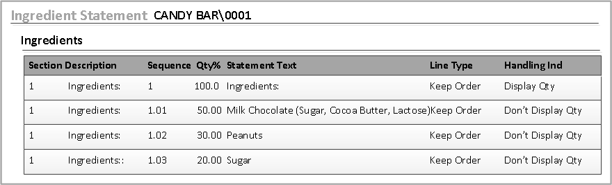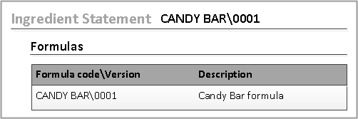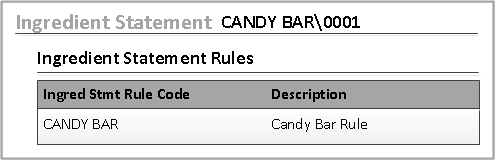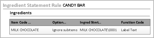Now, you are ready to add the MILK CHOCOLATE\0001 ingredient statement to another ingredient statement called CANDY BAR\0001. The entire process is explained here.