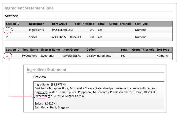 In this example, three item groups are used to create two sections and one subsection. The sections are: Ingredients and Spices. Sweeteners is a subsection of Ingredients.