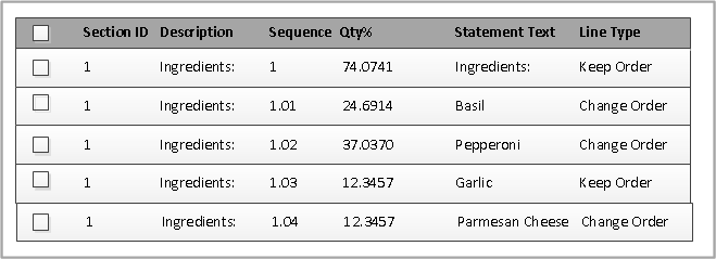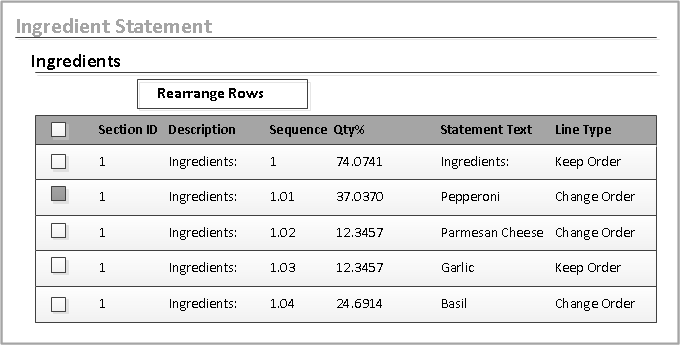 Rearranging rows in the ingredient statement Open the Ingredients tab in the Ingredient Statement form. Select a row that is marked with a Line Type of Change Order. Select Rearrange Rows. Any rows within the corresponding section that has a Line Type of Change Order are displayed in the dialog. Move the ingredients up or down in the Rearrange Rows dialog. The result is shown here. Basil is now sequence 1.01, Pepperoni is 1.02 and Parmesan Cheese is 1.04.